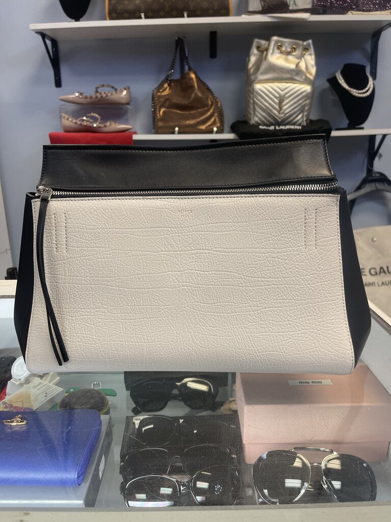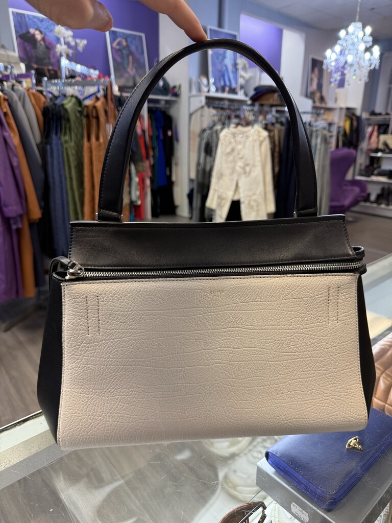 Refined, structured, and timeless — the Céline Edge Bag showcases the minimalist sophistication that defined Céline under Phoebe Philo. Crafted from supple black and ivory calfskin leather, this piece features clean architectural lines, a distinctive top-zip design that curves elegantly over the edge, and spacious interior storage. The combination of modern structure and effortless luxury makes it a true everyday statement piece.