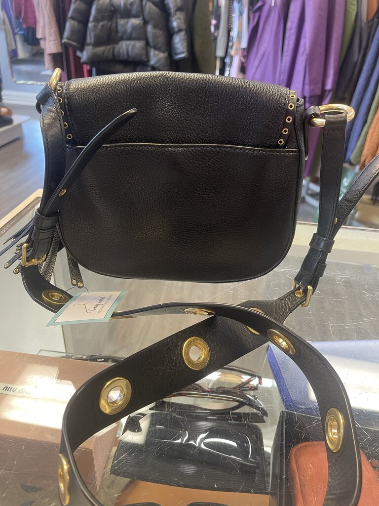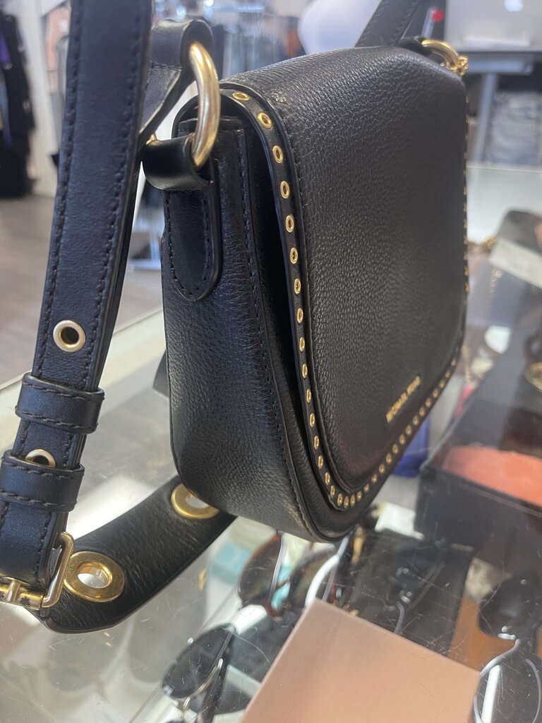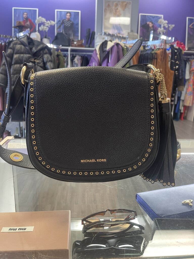 Michael Kors Black Pebbled Leather Crossbody Bag with Gold Stud Detailing A modern classic with a touch of edge, this Michael Kors black pebbled leather crossbody bag combines timeless sophistication with everyday functionality. Crafted from supple pebbled leather and adorned with gold-tone stud detailing, it’s the perfect statement accessory to elevate any outfit. The structured saddle shape gives it a refined silhouette, while the bold gold hardware and oversized leather tassel charm add a signature Michael Kors touch. Designed with an adjustable crossbody strap, this bag offers hands-free ease without compromising on style. Features • Authentic Michael Kors crossbody bag • Black pebbled leather • Gold-tone hardware and eyelet detailing • Front flap closure • Leather tassel charm with gold chain accent • Adjustable crossbody strap for comfortable wear • Interior slip pocket for small essentials • Michael Kors logo in gold on front Condition very good — minimal wear, clean interior, and hardware in beautiful condition.