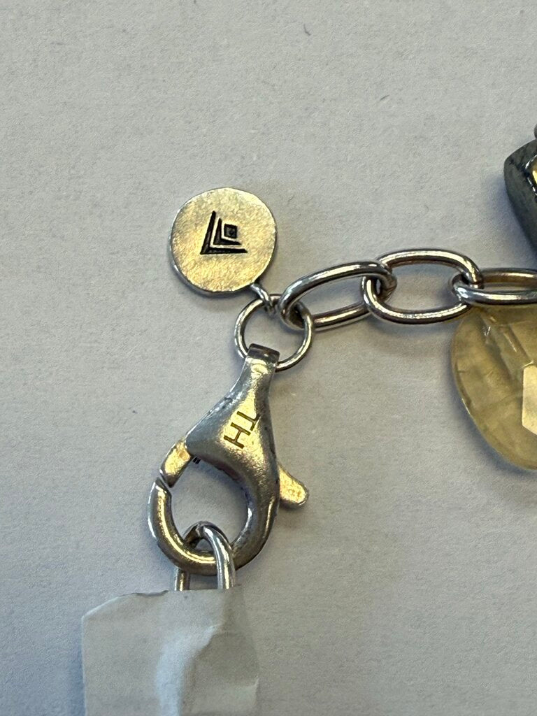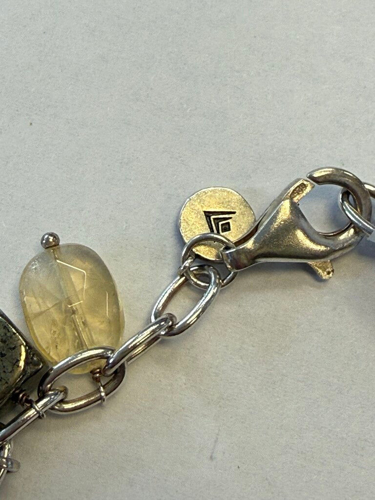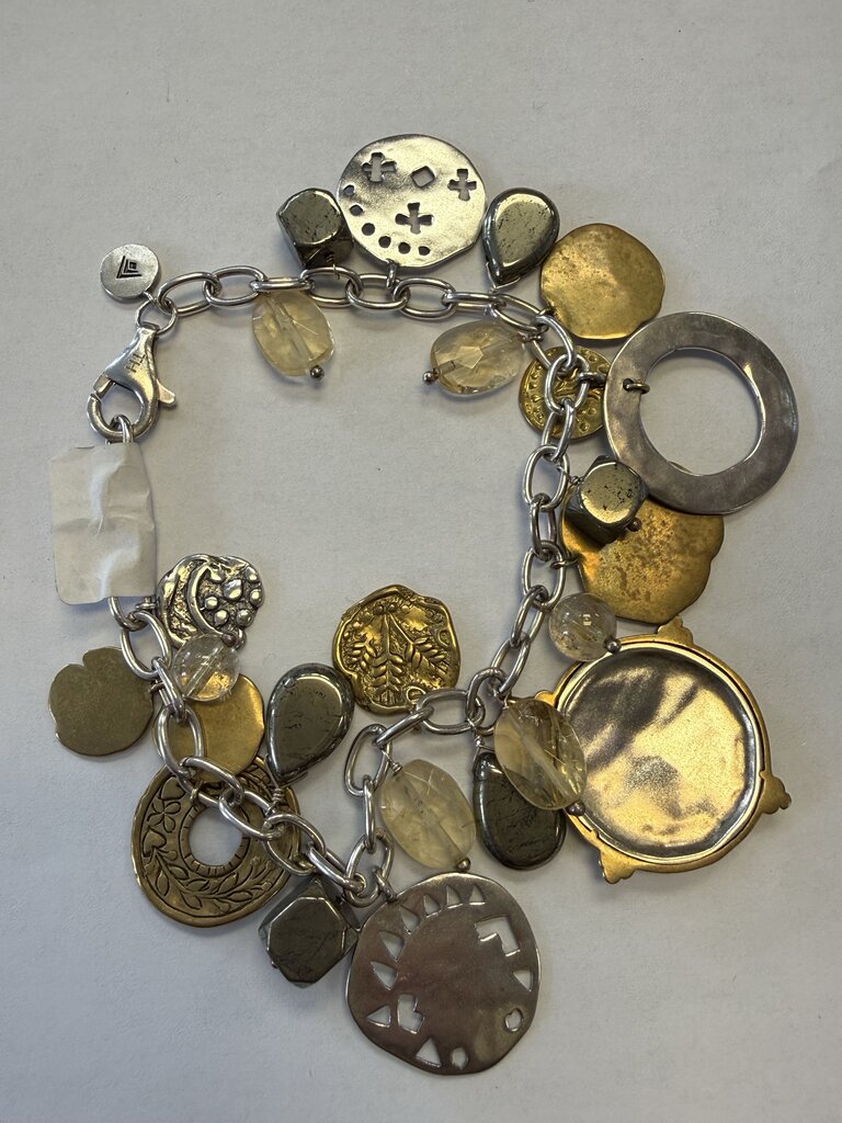 A beautifully detailed sterling silver charm bracelet by Silpada, featuring an eclectic mix of artisan-inspired charms in sterling silver and warm brass tones. This piece showcases Silpada’s signature handcrafted aesthetic with textured medallions, botanical motifs, and faceted stone accents including pyrite, citrine, and quartz. The combination of mixed metals and organic elements creates a rich, layered look that pairs effortlessly with both casual and dressy styles.